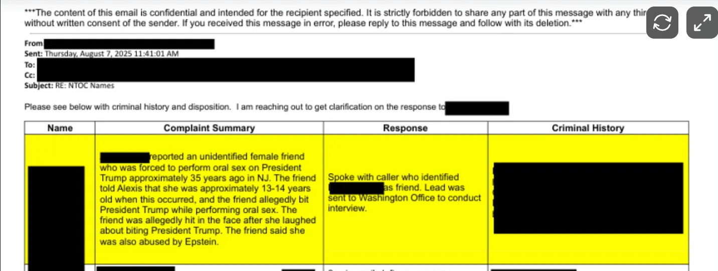 The tipster told the FBI that her friend was forced to perform oral sex on Trump approximately 35 years ago in New Jersey. The friend said the girl was about 13 or 14 when it happened, and that her friend bit Trump while she was performing oral sex. Trump allegedly responded by slapping the girl in the face. The tipster alleged that she too had been abused by Epstein.