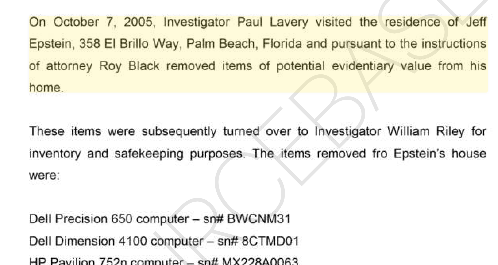 But the most important evidence that was seized was three of Epstein’s computers. The chain of custody of that evidence has also been known for years from the court files. Private investigator Paul Lavery removed the evidence and turned the material over to another private investigator named William Riley. Riley, upon instructions from Black, then stored them, court files show.